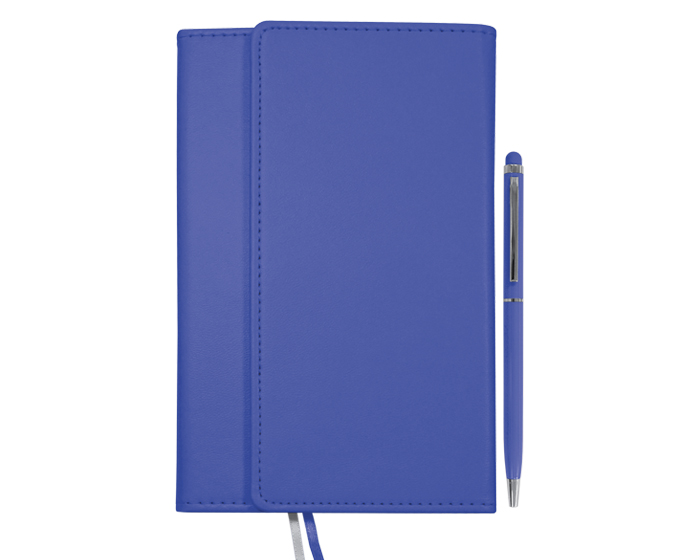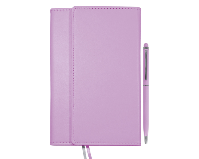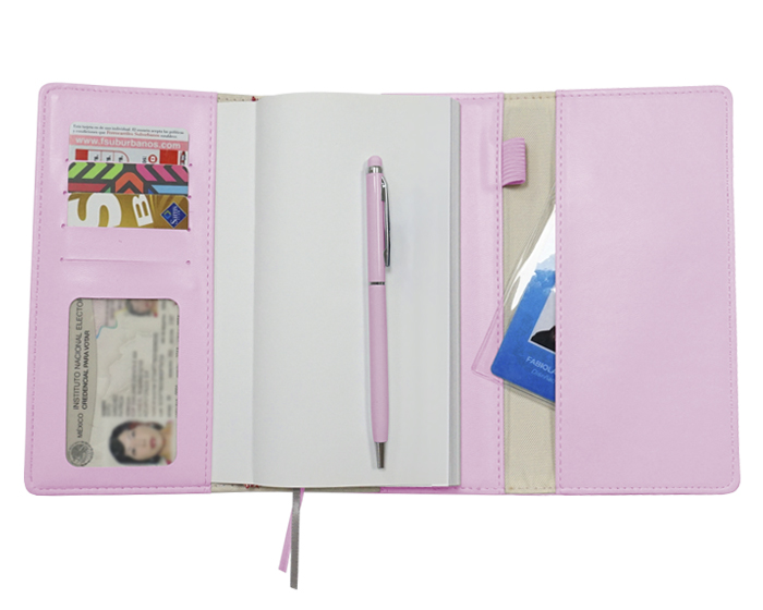 Libreta personal tipo agendario estilo cartera, de 99 hojas (198 páginas). Su cubierta cuenta con 4 compartimentos para credenciales, uno con ventana plástica; separador de doble de listón y bolígrafo metálico con punta touch, el cual es de mecanismo retráctil, del color de la libreta. Contiene: hoja de datos personales, hojas rayadas con área para fecha, hojas punteadas para gráficos o dibujos y sección de directorio de contactos. Presentación: caja en color blanco con cubierta transparente.